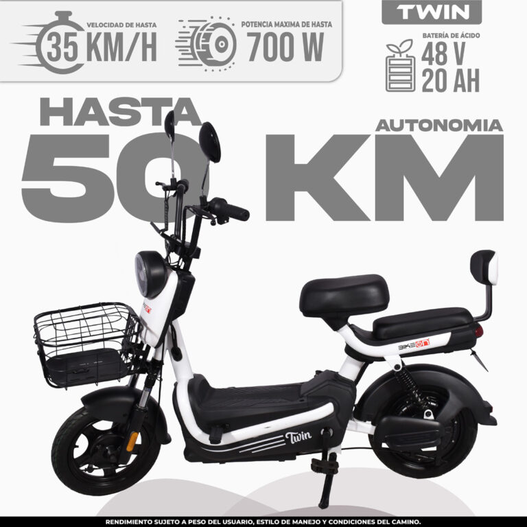 La TWIN es una bicimoto eléctrica diseñada especialmente para desplazamientos urbanos. Su diseño compacto, elegante y ágil la convierte en la mejor opción para moverse por la ciudad de forma rápida, eficiente y con estilo. Está equipada con un motor de 700 W, ideal para una conducción suave, y una batería de ácido 48V 20Ah, que ofrece una autonomía de hasta 50 km y una velocidad de 30 a 35 km/h, al usar el modo asistido.